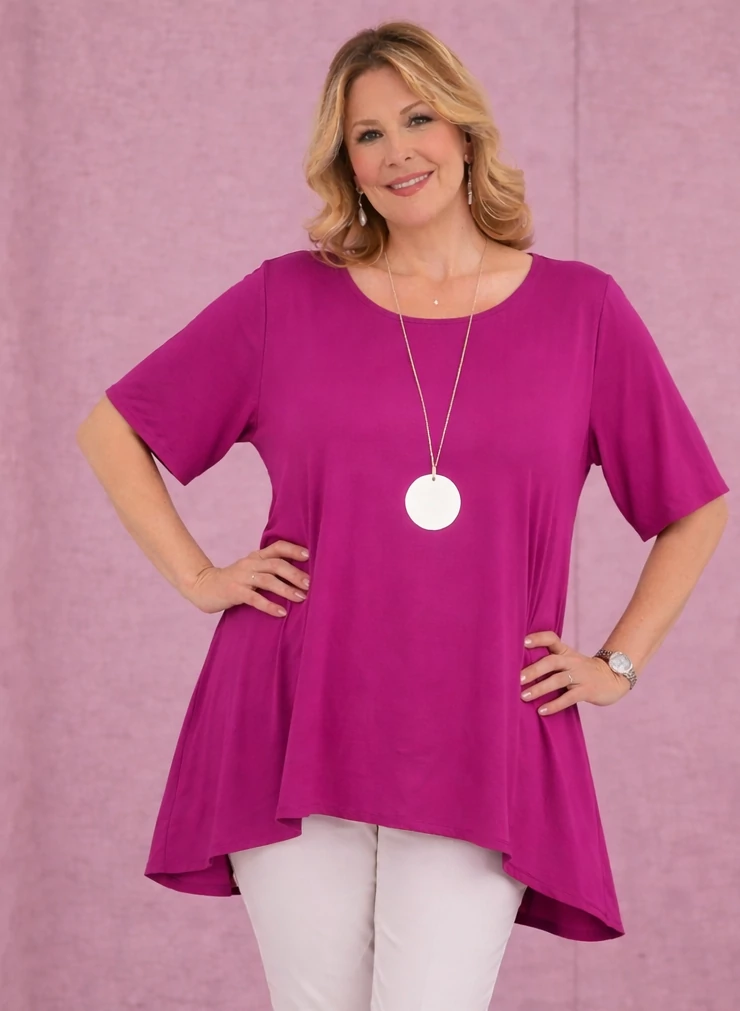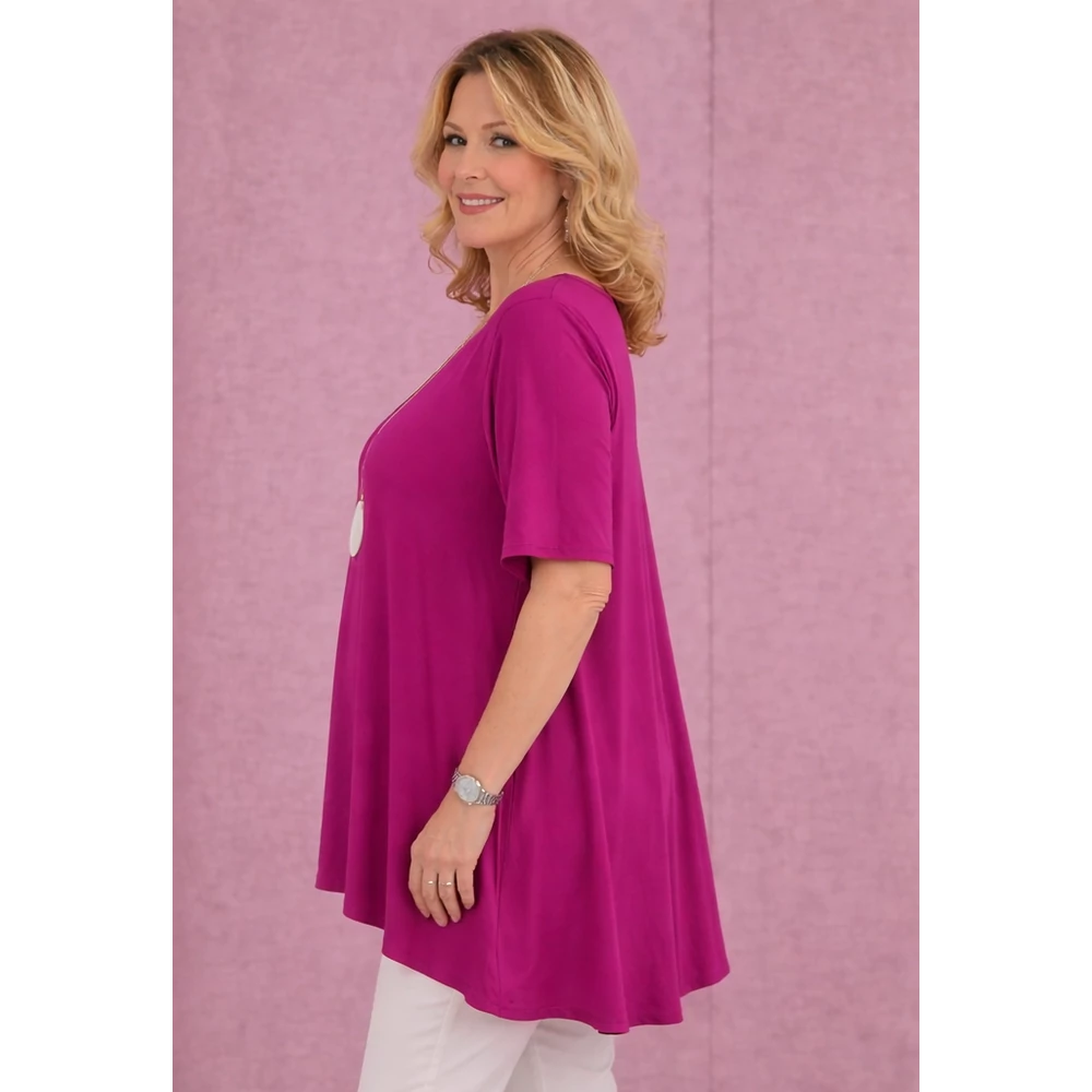 Kerekített nyakú, oldalra bővülő fazonú, diszkrét sliccelt megoldással.