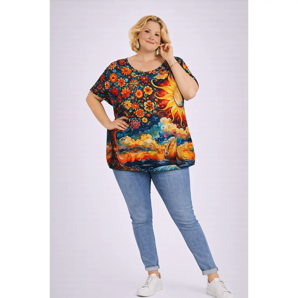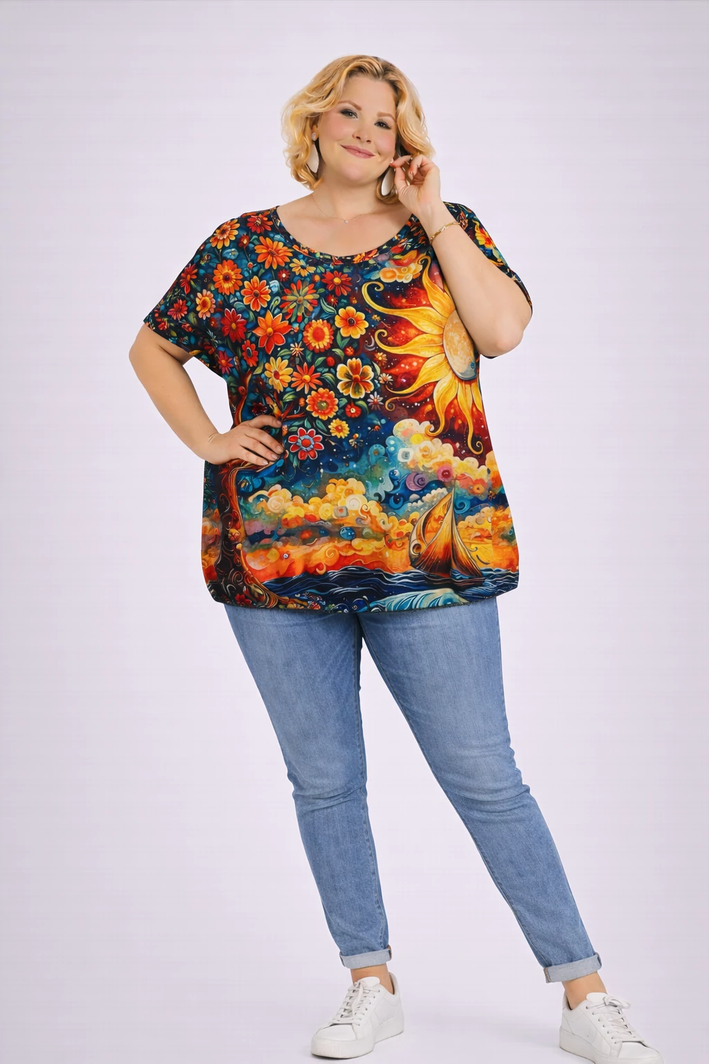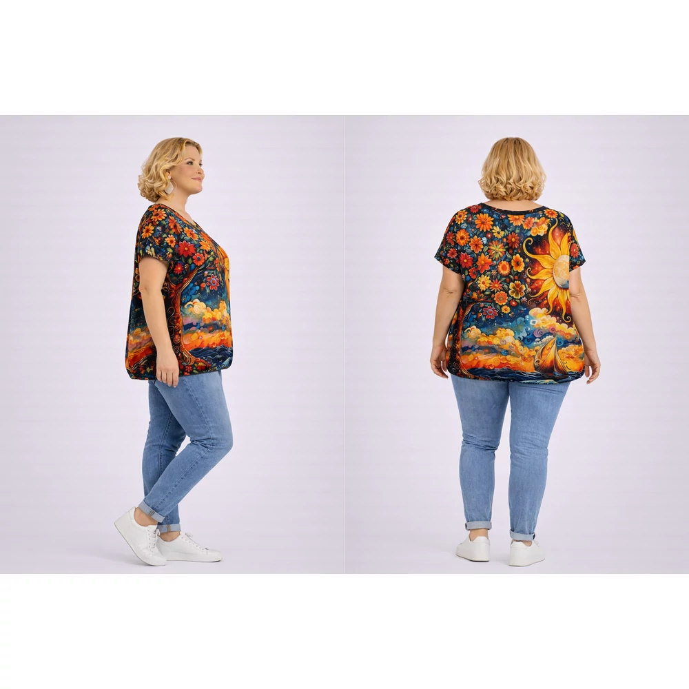 Selyempamut anyagból készült, igazi tavaszi / nyári mintás rövid ujjas, kerek nyakú felső.