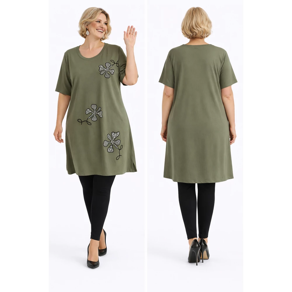 Strasszos, virágos pamut ruha- KHAKI