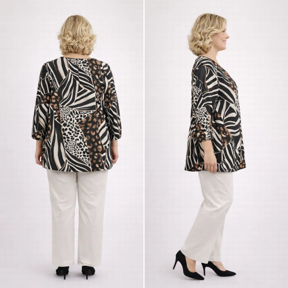 Jégselyem anyagú, vasalást nem igénylő divatos mintájú felső.