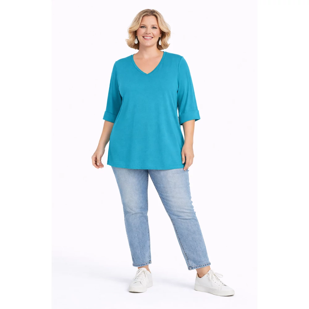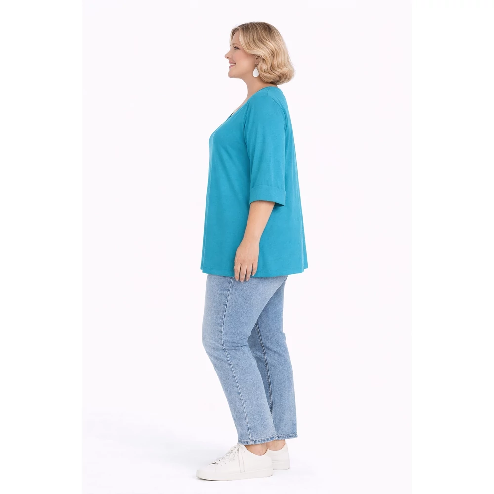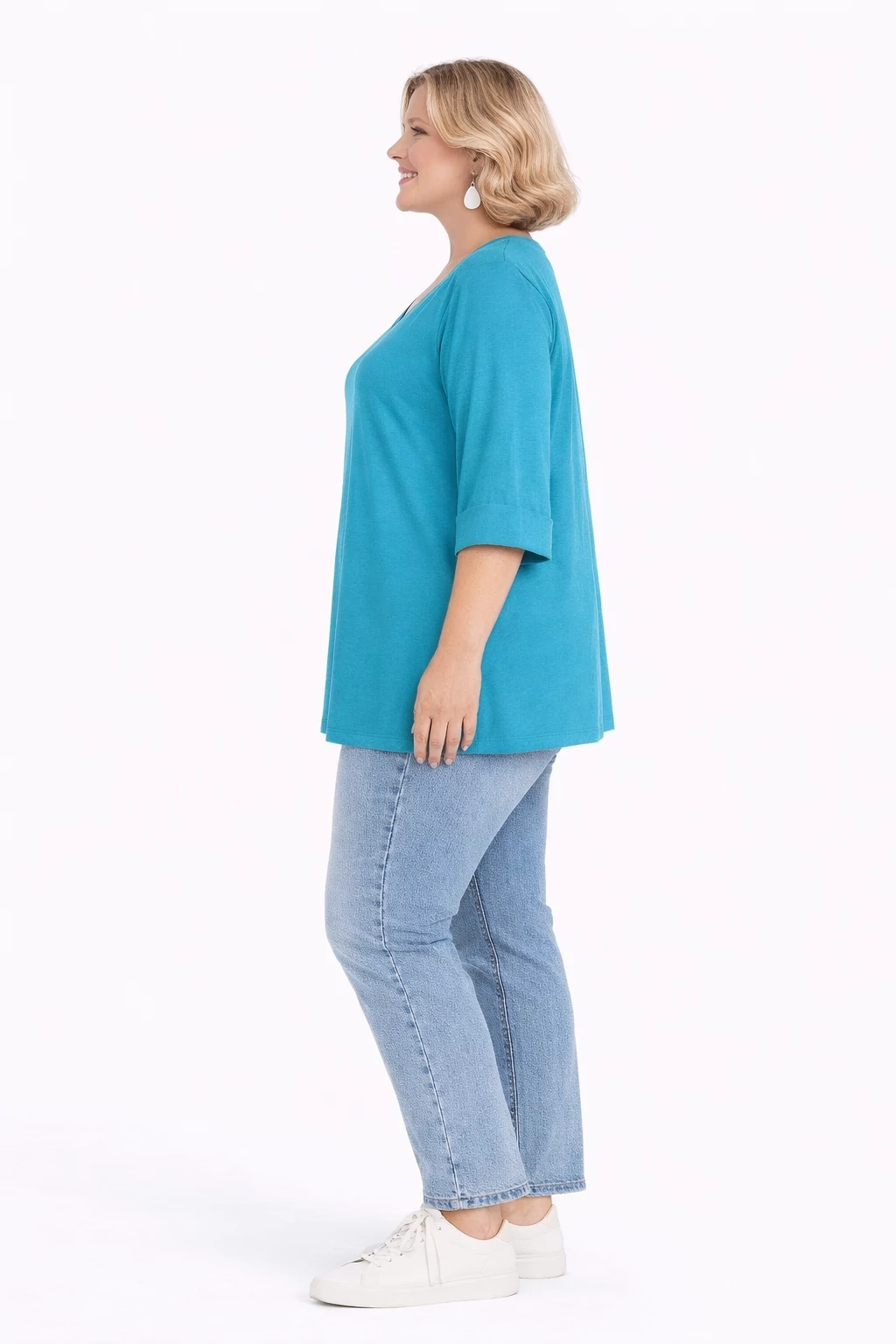 Ujján, alján passzés V nyakú pamut felső - TÜRKIZ - 48-54 méret