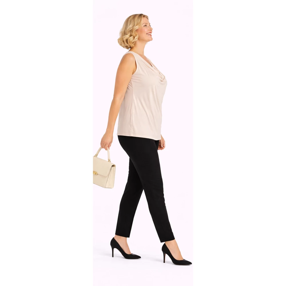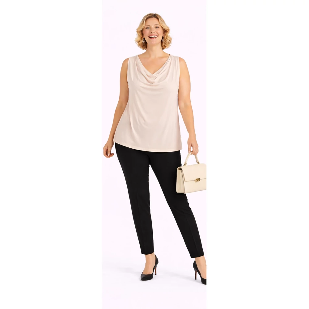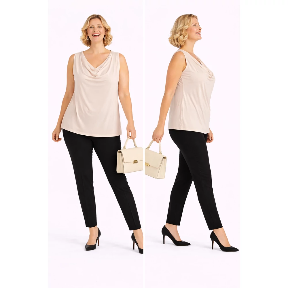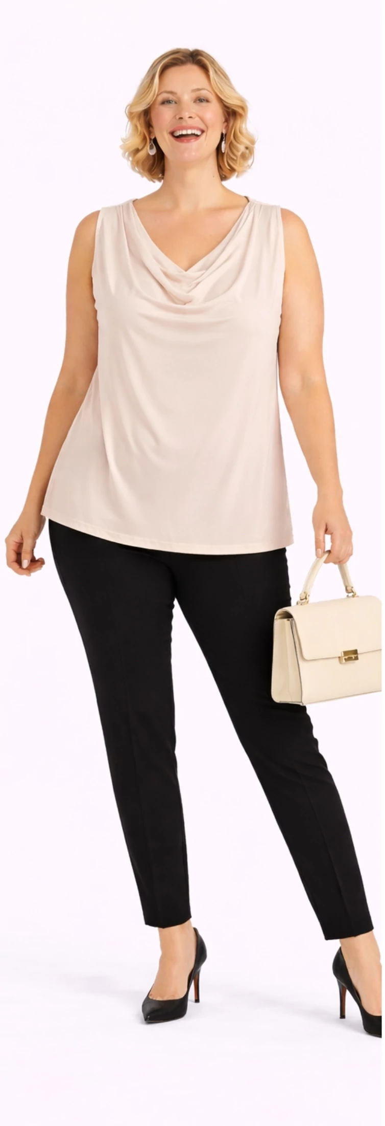 Lágyan leomló ejtett nyakú ujjatlan nyári felső. A dekoltázst körbe öleli.
