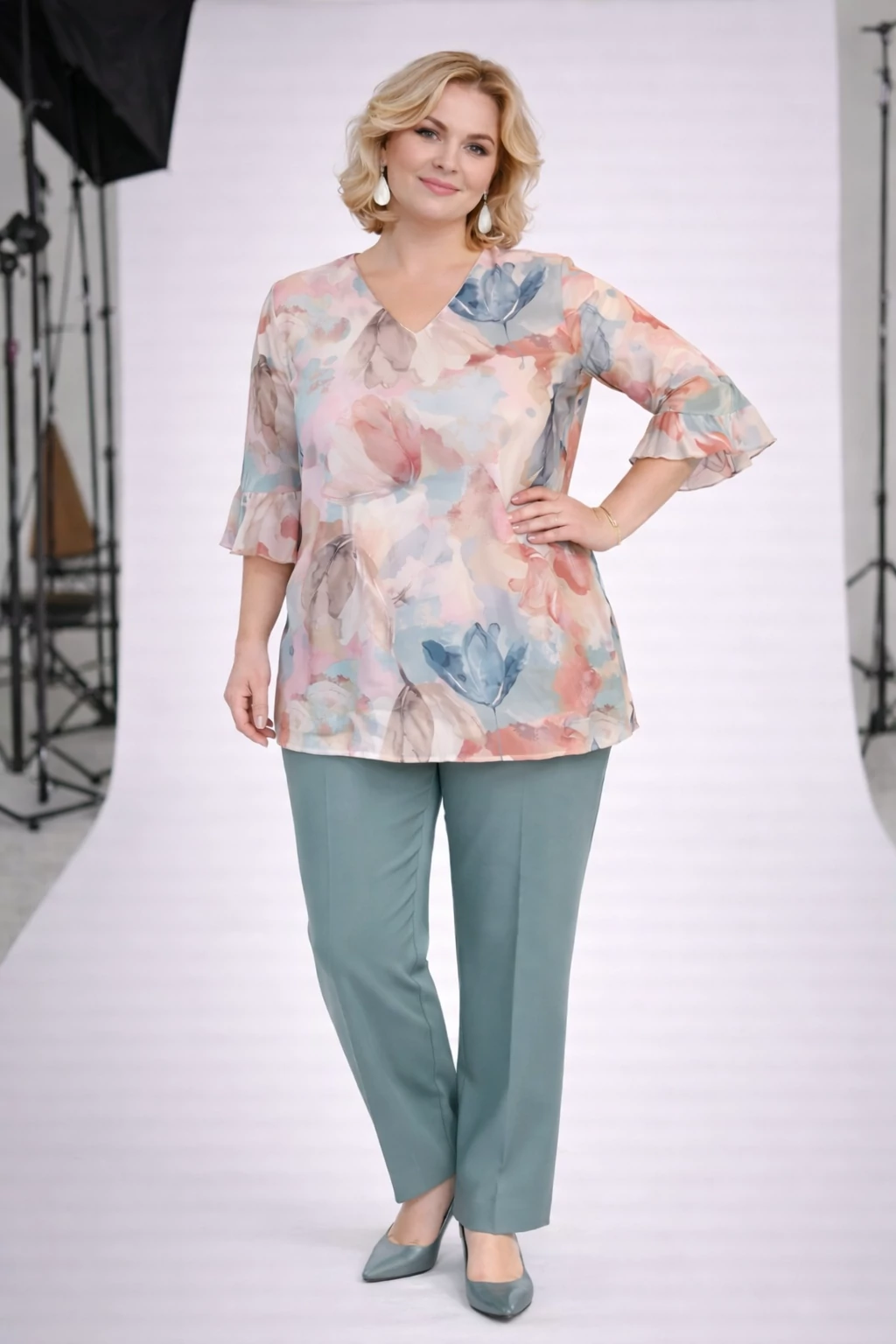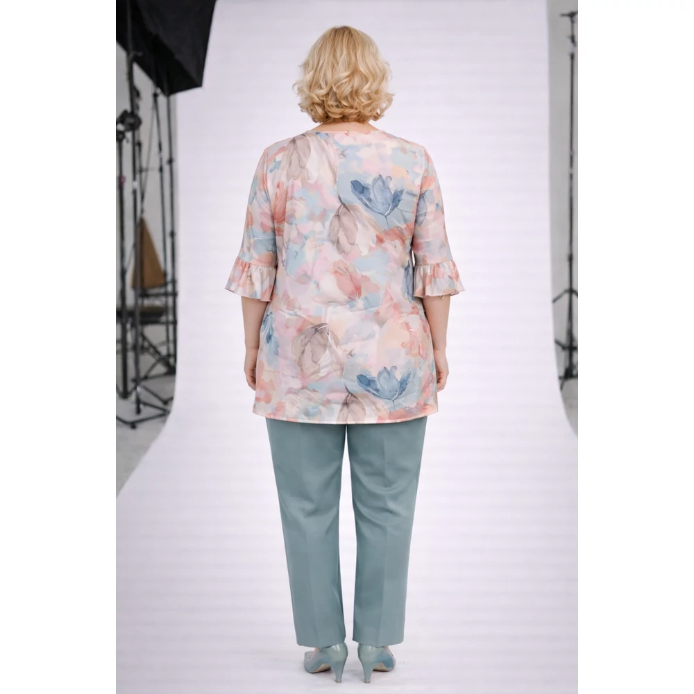 Ujja a közkedvelt könyék alá érő megoldás, egy kis fodorral díszítve.