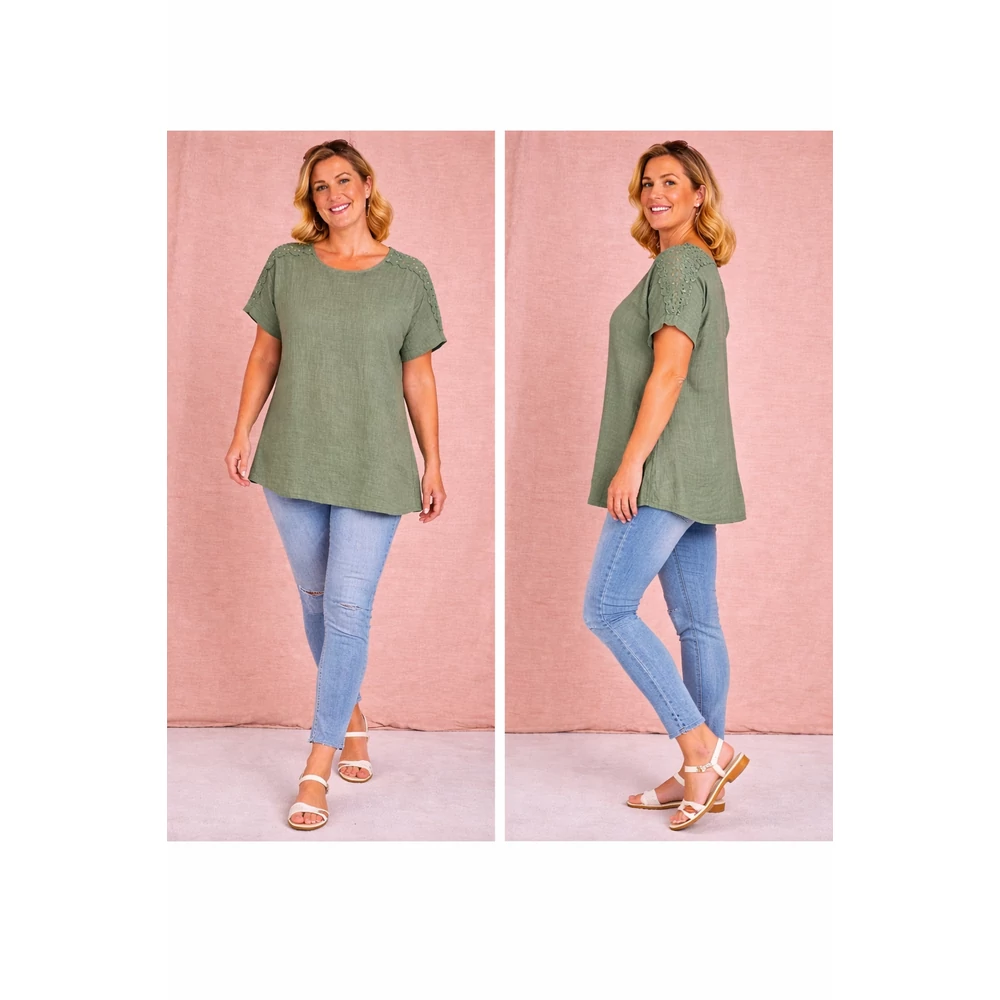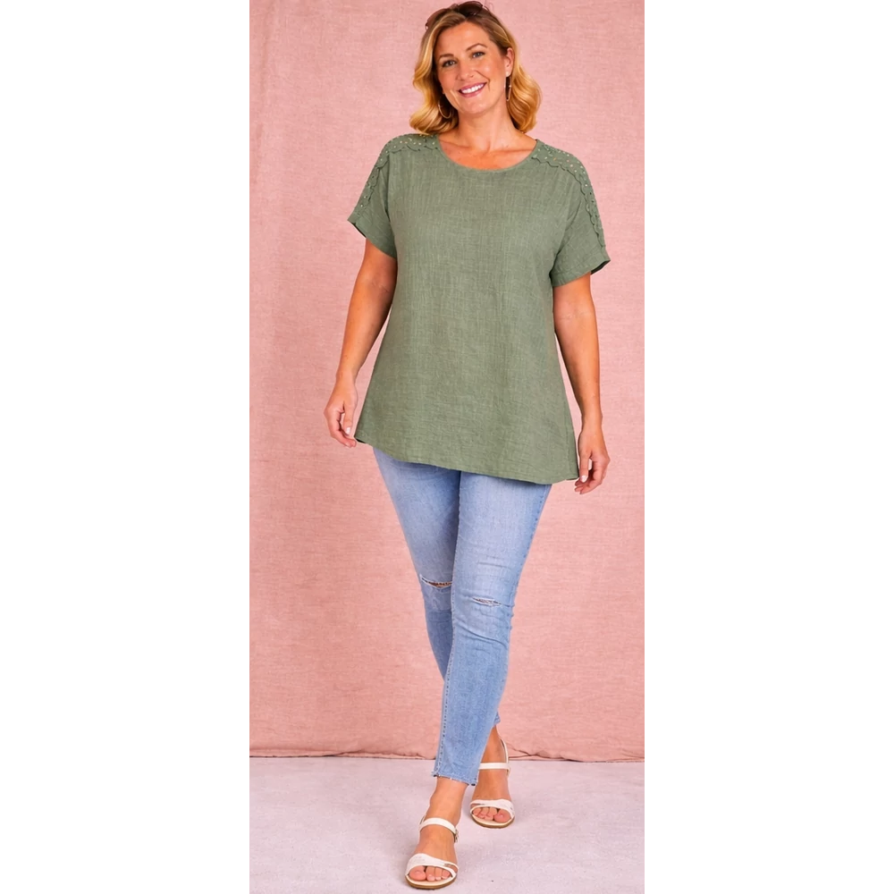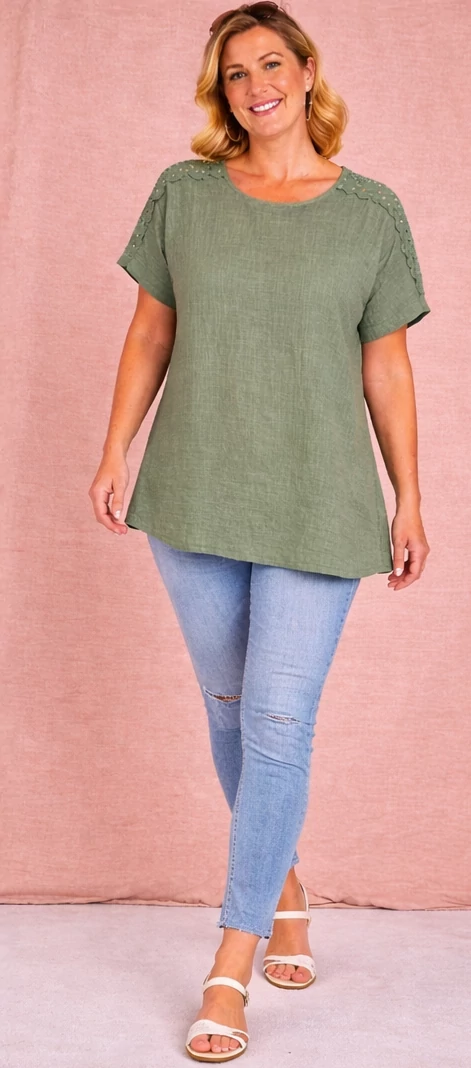 Szellős, kellemes viselet a forró nyári napokon ez a csodás horgolt vállán berakásos lenvászon felső.